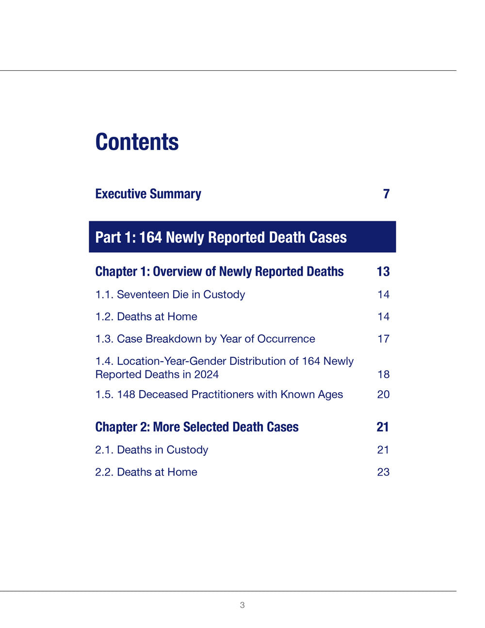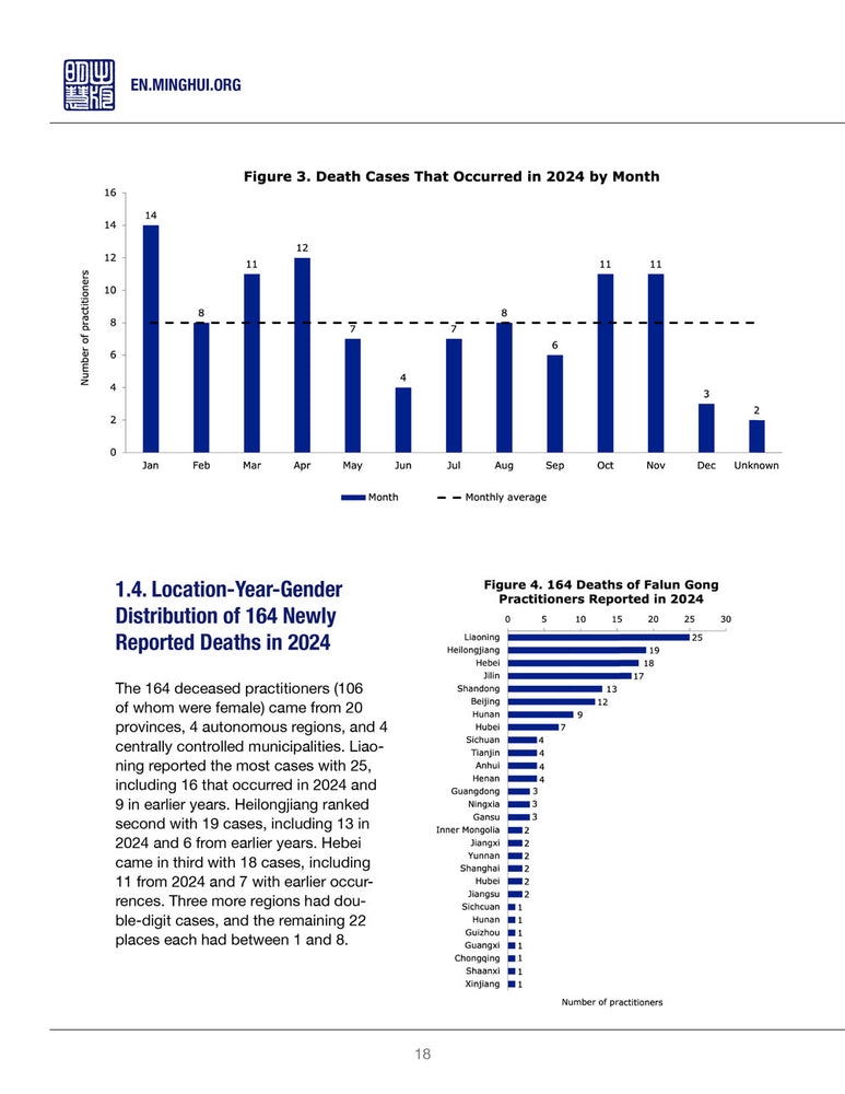 This annual report by Minghui.org presents the latest developments in the persecution of Falun Gong by the Chinese communist regime. In 2024, Minghui.org reported the deaths of 164 Falun Gong practitioners, bringing the total number of documented deaths as a result of the persecution to over 5,200. In addition, a total of 764 sentencing cases were reported, as well as 5,692 cases of arrests and official harassment of Falun Gong practitioners for their faith.